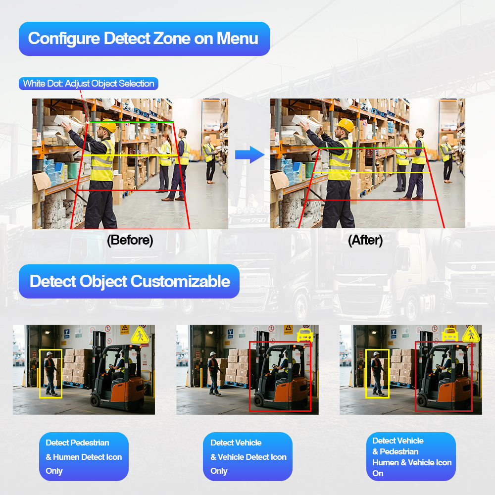 AI Holttér-észlelő tolatókamera Beépített színváltó figyelmeztető lámpaA mesterséges intelligencia holttérészlelő kamerarendszerének beépített színváltó figyelmeztető lámpája egy intelligens járműbiztonsági készlet, amely AI BSD-kamerát és AI-monitort tartalmaz, amelyek támogatják az AI-kalibrálás beállítását, lehetővé teszik a felhasználó számára az AI-beállítások módosítását, például az érzékelési terület méretének beállítását, a választható hangriasztás típusát, a gyalogosészlelés be- és kikapcsolását, a járműérzékelés be- és kikapcsolását és bármely más kalibrálást.