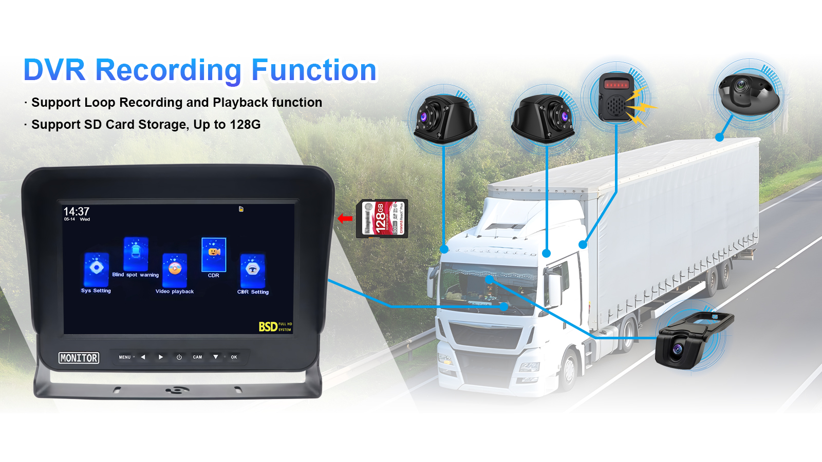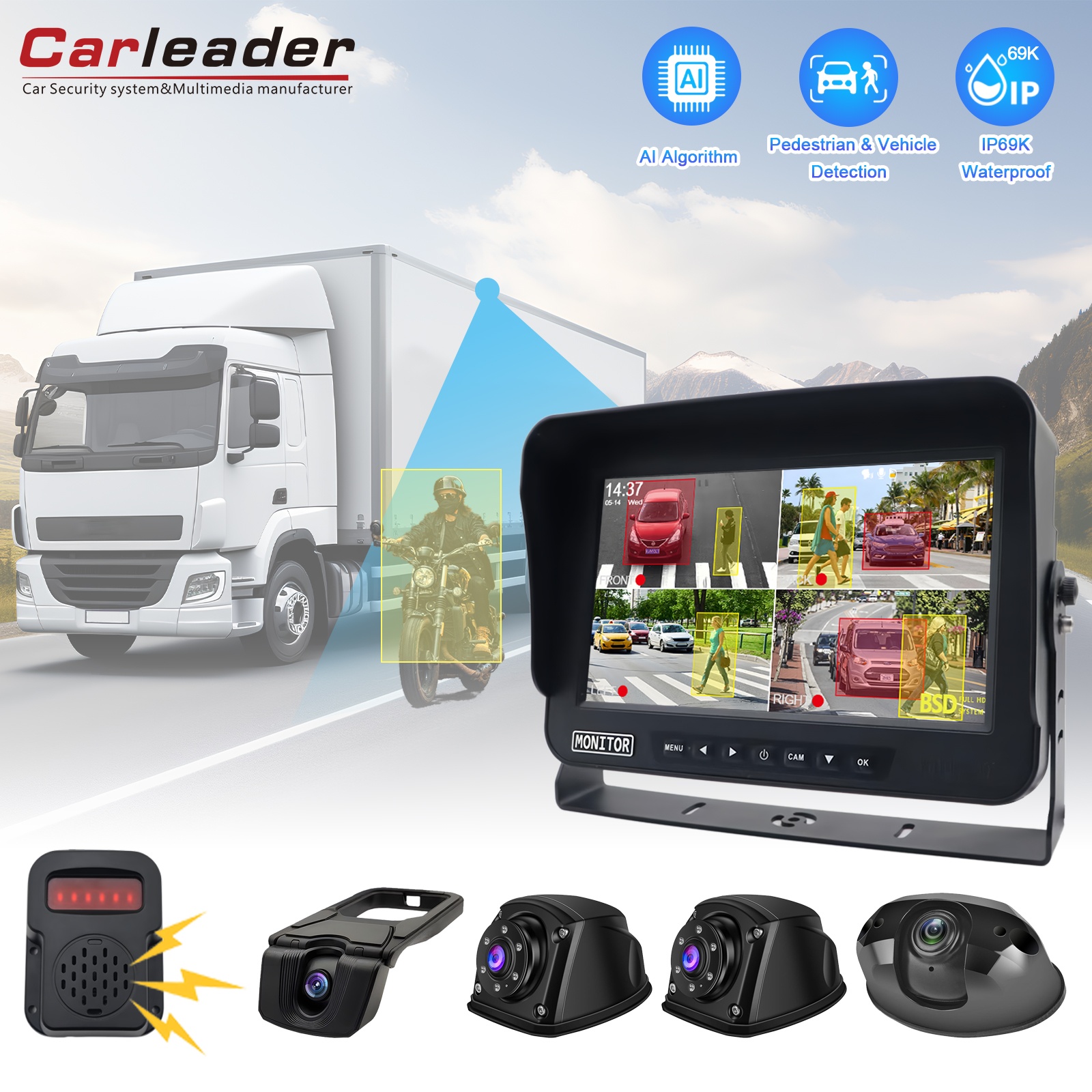 Carleader 10,1 hüvelykes jármű BSD Blind Spot Detektáló rendszer, teherautók, buszok, expressz autók és speciális járművek számára tervezték. Fejlett AI képalkloritmusokkal és nagy teljesítményű chipekkel felszerelt rendszer intelligensen érzékeli a gyalogosokat, a kerékpárosokat, a motorkerékpárokat, a kisteherautókat és az állatokat vak helyeken, időszerű figyelmeztetéseket biztosítva az ütközések megelőzése érdekében.