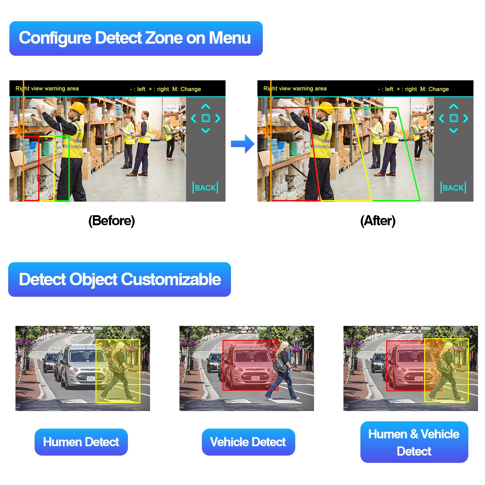 Intelligens észlelés: Valós idejű figyelmeztetések a vak zónákba belépő tárgyakra, támogatják az AI funkció kalibrálását, a trapézi kalibrációs vonalakon keresztül állíthatók be (zöld figyelmeztető területek, kék a jármű-föld igazításához).