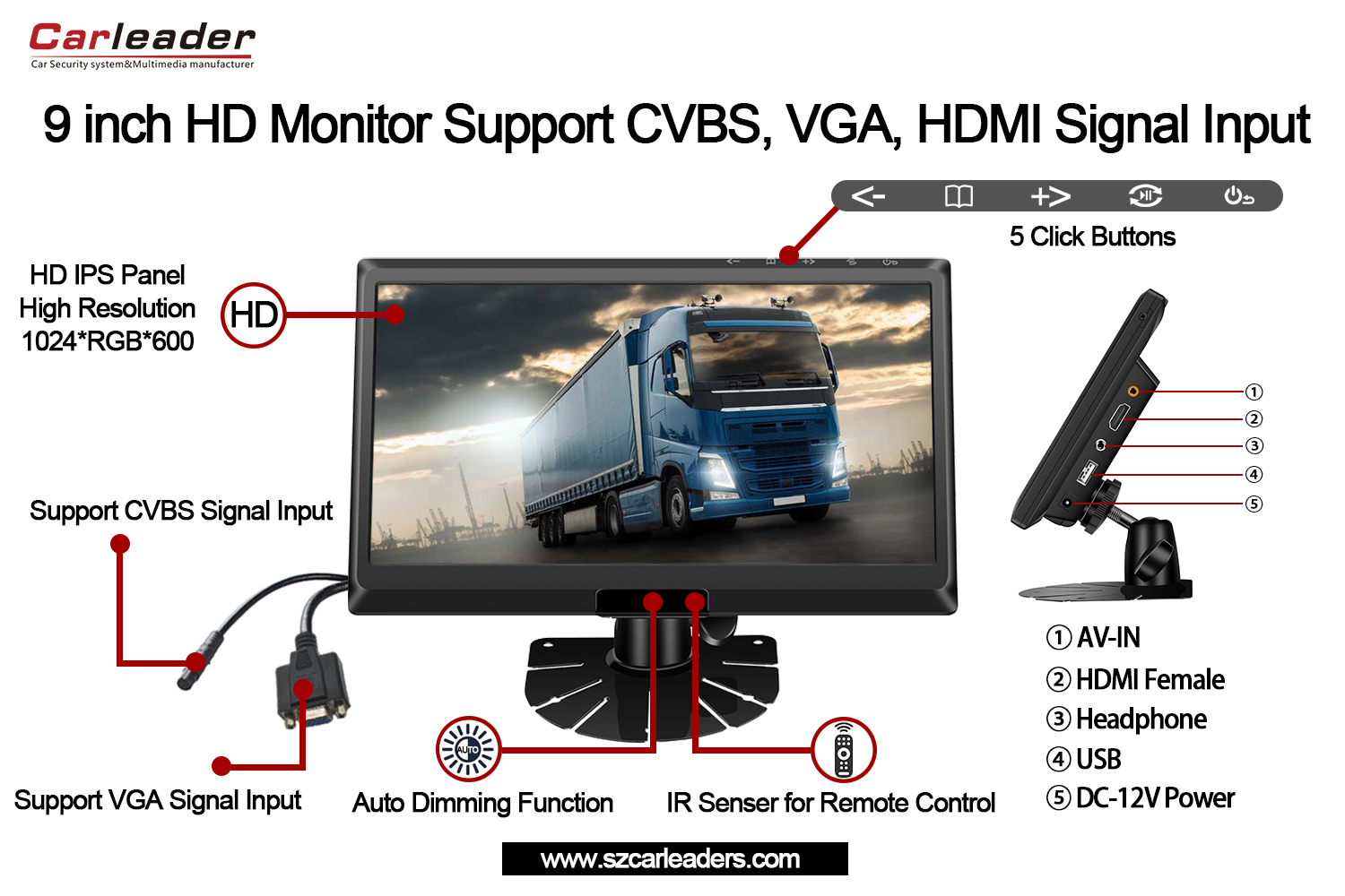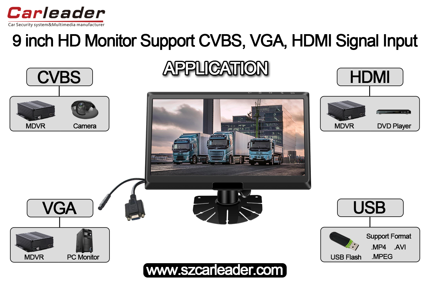 Karvezető9 hüvelykes IPS képernyő HD monitor támogatja a CVBS+HD+VGA bemeneteketegy nagy teljesítményű HD monitor, amelyet járművek megfigyelésére és MDVR flottakezelésre terveztek. Az autós monitor támogatja a CVBS, HD és VGA jelbemeneteket. És ha az MDVR rendelkezik VGA vagy HD interfésszel, akkor használható a 9 hüvelykes IPS képernyős autómonitorral.