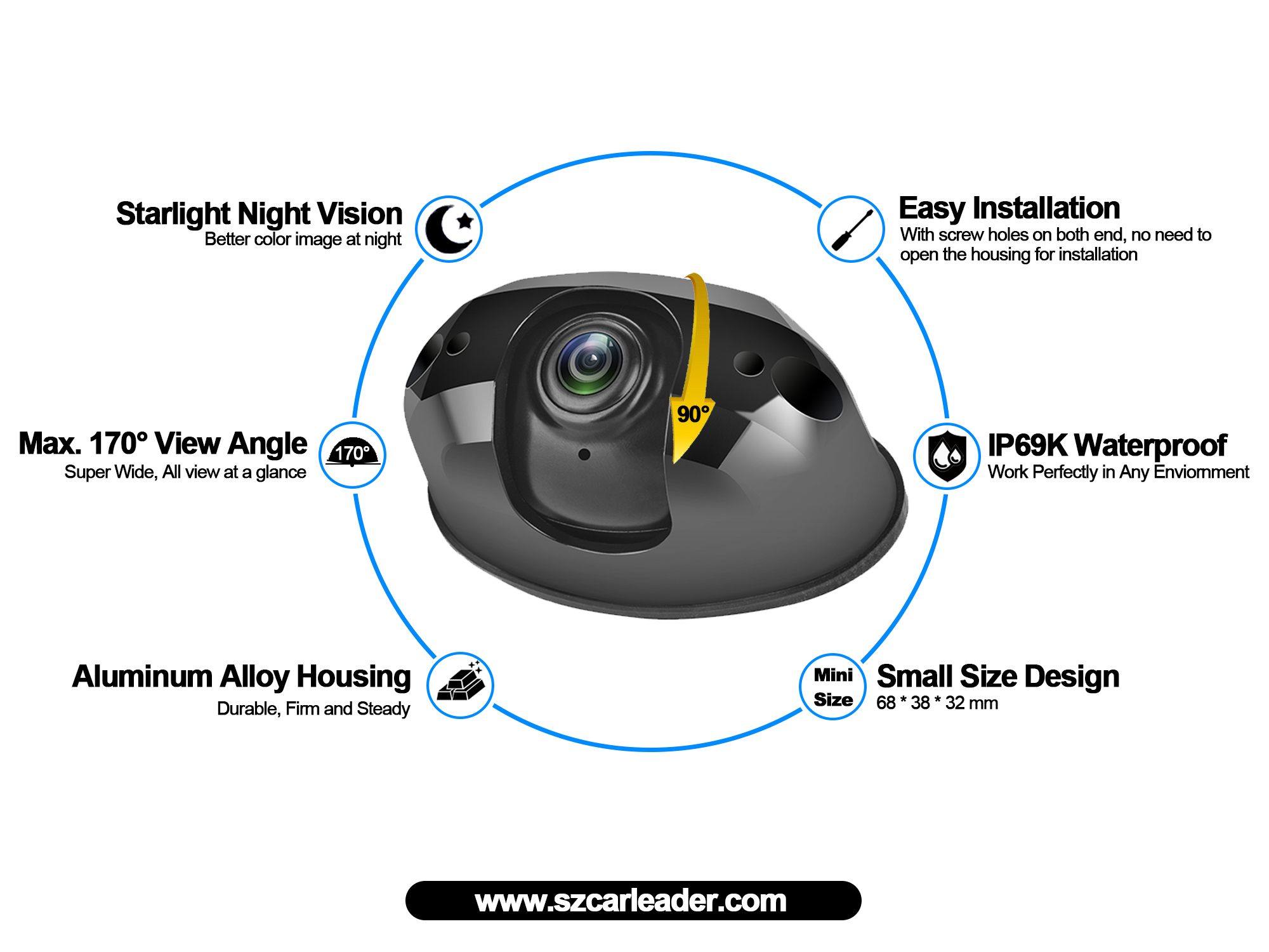 Az AHD 170 fokos széles látószögű, vízálló, nagy teherbírású tolatókamera tiszta, valós idejű képet biztosít a vezetőnek a vezetési folyamat során. Szupernagy, akár 170°-os szöge, ami a vezető számára széles körű megfigyelési tartományt biztosít, így a vezető holtterek nélkül figyelheti a jármű körüli környezetet