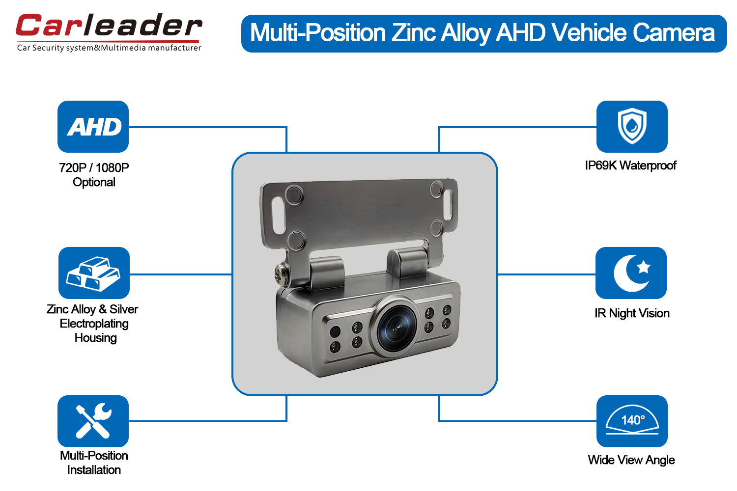 KarvezetőAHD ezüst galvanizáló jármű tolatókamera, cinkötvözet házzal és ezüst galvanizálással, 140 fokos látószöggel és IP69K víz- és porállósággal. A beépítési szög és pozíció csavarokkal is rögzíthető.