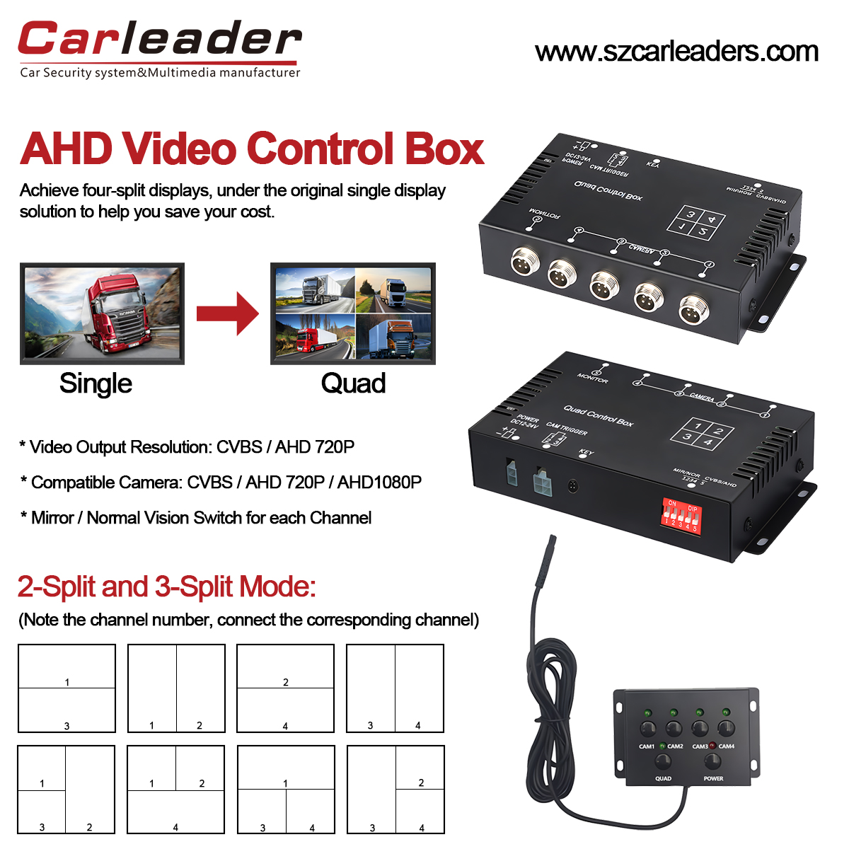 Ennek az AHD quad video split boxnak a magja egy tápegység és egy videó multiplexer, amelyek egyetlen járműben használhatók. Mint például a buszok, teherautók, pótkocsik és más nehéz tehergépjárművek.4 csatornás, akár négy független AHD-kamera támogatására tervezték. És dolgozzon egyetlen monitorral. A négycsatornás nézet az AHD 4 csatornás vezérlődoboz elsődleges funkciója. A jármű AHD osztott vezérlődoboza videojeleket fogad mind a négy csatlakoztatott autókamerától, és mind a négy képet egyszerre jeleníti meg egyetlen képernyőn. A vezérlődoboz a doboz egyéb funkcióira utal, az AHD osztott vezérlődoboz pedig tápellátást biztosít a kamerák számára, és akár egyetlen kijelzőt, akár osztott képernyős kijelzőket vezérel. Az AHD (Analog High Definition) a kijelzővel és a vezérlődobozzal kompatibilis videóformátumokat határozza meg. Az AHD videóvezérlő doboz alkalmas AHD kamerákhoz (pl. AHD 720p, 1080p) vagy CVBS kamerákhoz. Egyszerre csak négy AHD kamera vagy négy CVBS kamera támogatott.