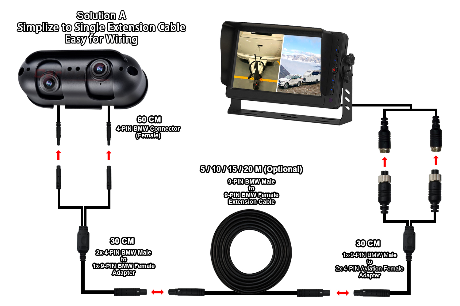 Az első megoldás csak egy hosszabbító kábelt (9 PIN-es BMW csatlakozó), 1-2 osztott kábelt használ mindkét végén a kamera és a monitor csatlakoztatásához. Mert ez a megoldás csak nekünk hosszabbító kábellel történik, ami megkönnyíti és kényelmesebbé teszi a bekötési folyamatot.