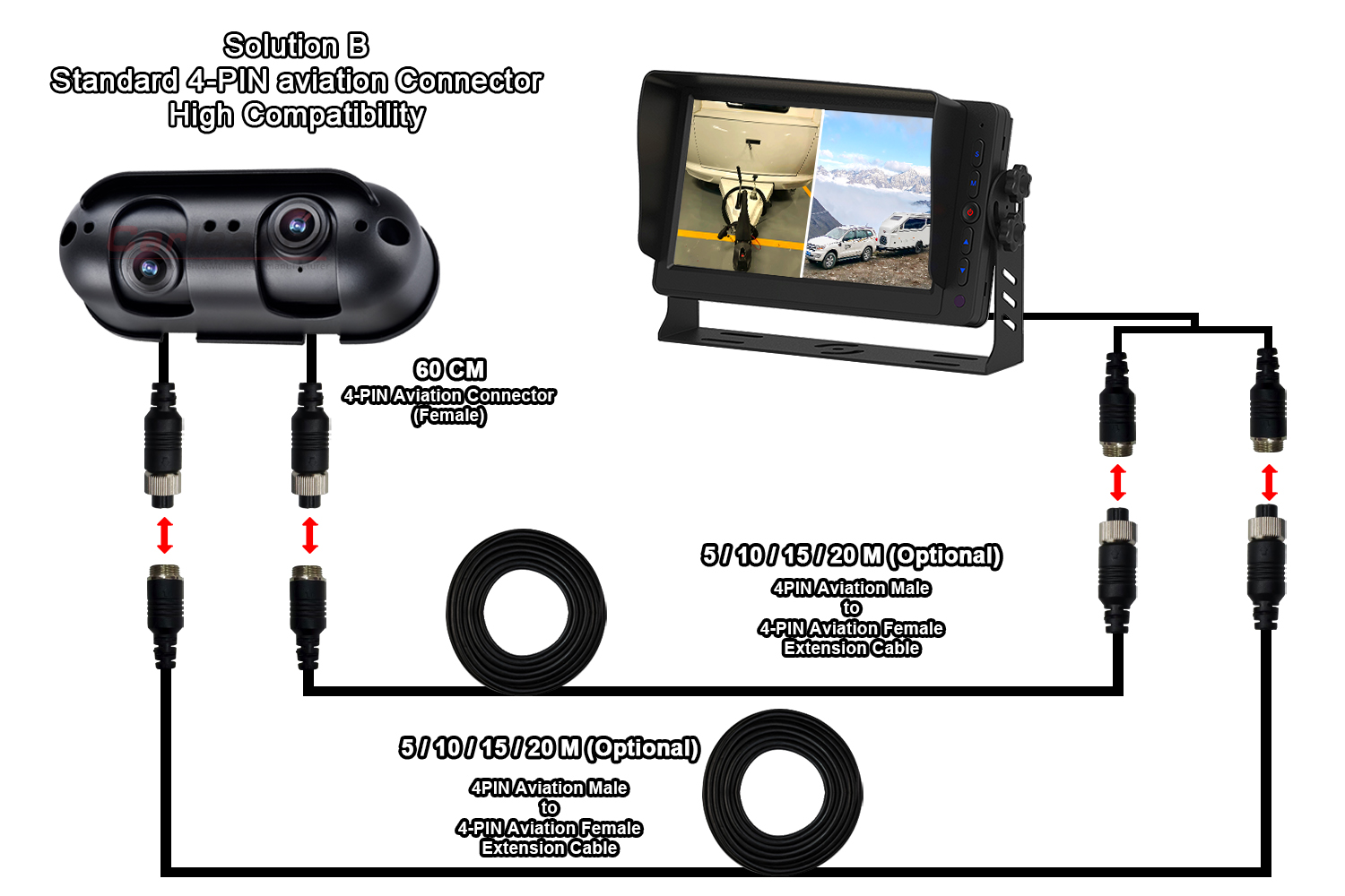 A Carleader két különböző huzalozási megoldást kínál az AHD Starlight kétlencsés tolatókamerához, amely alkalmas lakóautóhoz, a különböző vezetékezési igényekhez: