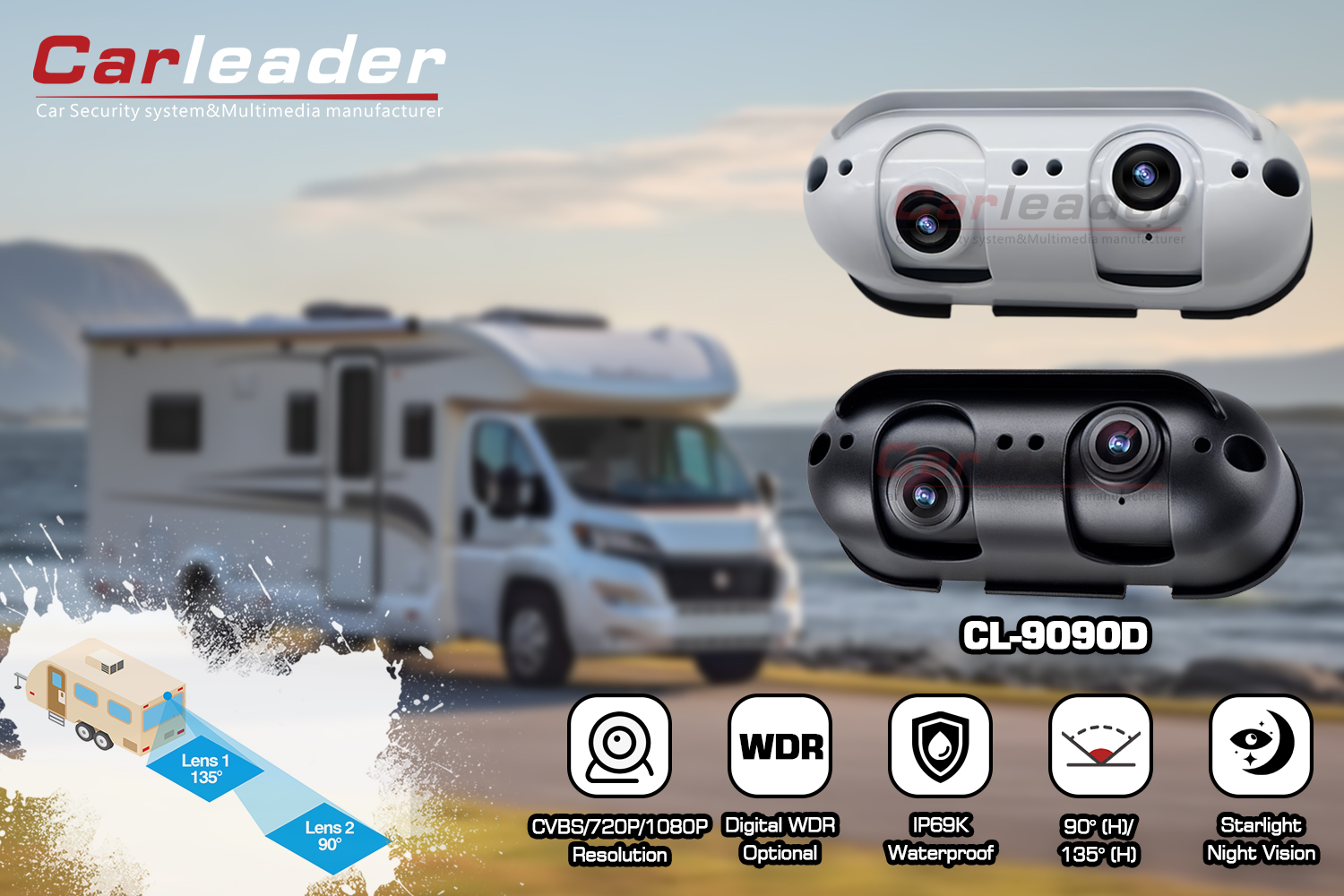 KarvezetőAHD Starlight kétlencsés tolatókamera lakóautóhoz, a Carleader saját szerszámos AHD tolatókamera, a kettős lencsés kialakítás lehetővé teszi a felhasználó számára, hogy jól látható legyen a közeli és távoli visszapillantó látás során. Alumíniumötvözet háza és IP69K besorolása masszívabbá és tartósabbá teszi a kamerát bármilyen zord időjárási körülmények között. Ez a kamera nem csak nehéz tehergépjárművekhez, például teherautókhoz, buszokhoz, targoncákhoz stb. lakóautókhoz is alkalmas, mint például lakóautó és lakókocsi.