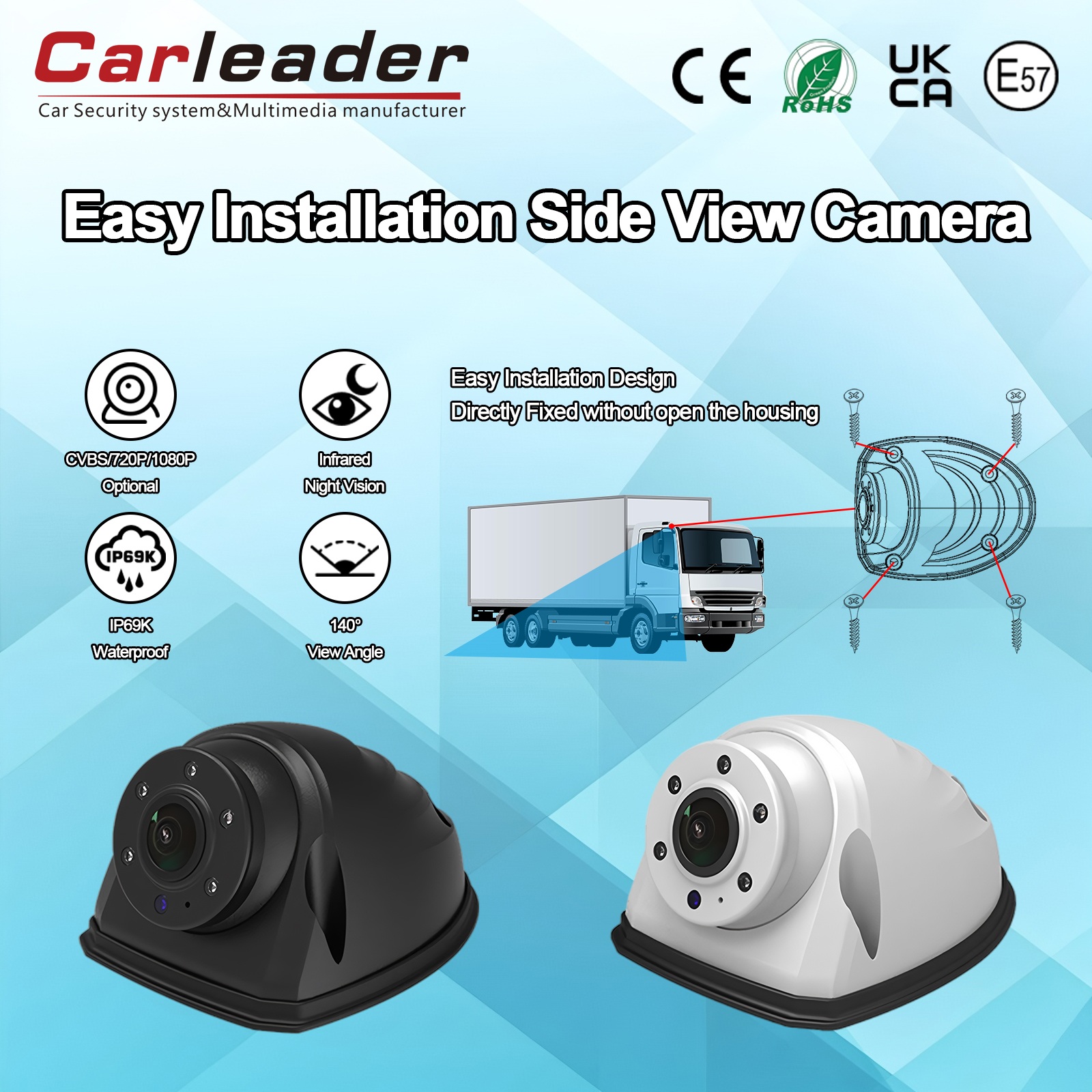 KarvezetőAHD gyors telepítés nagy teherbírású oldalnézeti kamera fehéregy nagy teljesítményű oldalnézetű AHD kamera, amelyet úgy terveztek, hogy tiszta látást biztosítson bármilyen zord időjárási körülmények között. Főleg multifunkcionális és tartós teljesítményére tervezték, ez a kompakt kamerarendszer haszongépjárművekhez, ipari berendezésekhez és biztonsági alkalmazásokhoz alkalmas, ahol tiszta perifériás látásra van szükség.