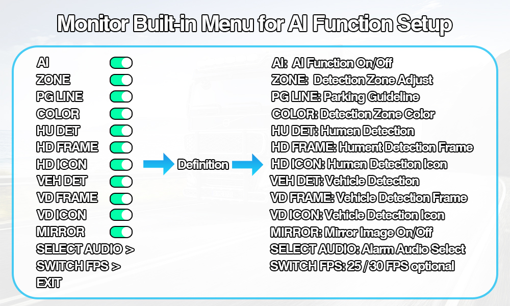 Testreszabható mesterségesintelligencia-kalibráció: Könnyedén beállíthatja az AI-észlelési területeket a monitor intuitív képernyőmenüjén keresztül, de választhat, hogy csak a gyalogosokat, csak a járműveket vagy mindkettőt figyeli – a be- és kikapcsolható érzékelési kerettel és tárgyikon (Gyalogos vagy Jármű) fedvényekkel az egyértelmű vizuális visszajelzés érdekében.